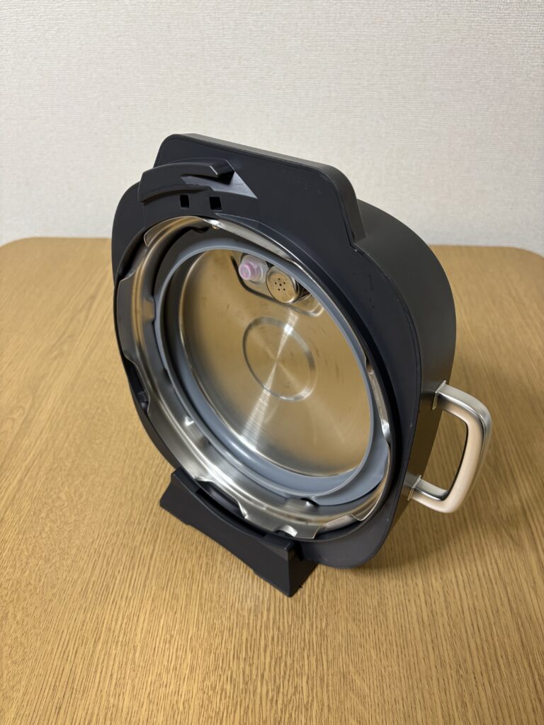 前回のKPC-MA2-B」では出来上がった料理をよそう時に上蓋をどうするか悩むことがありましたが、「PMPC-REMA3」にはフタスタンド付属されており、あの重い蓋をどこに置こうか毎回迷うことがなくなりました。